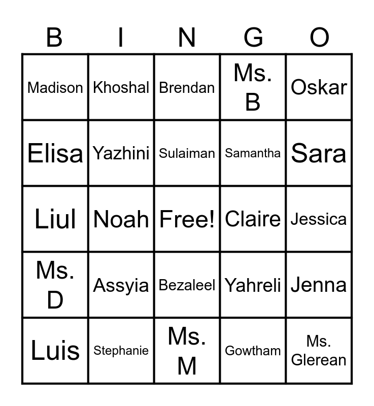 This bingo card has a free space and 24 words: Assyia, Stephanie, Sulaiman, Luis, Oskar, Madison, Elisa, Khoshal, Claire, Bezaleel, Samantha, Liul, Yahreli, Jenna, Yazhini, Gowtham, Jessica, Brendan, Sara, Noah, Ms. Glerean, Ms. D, Ms. B and Ms. M.