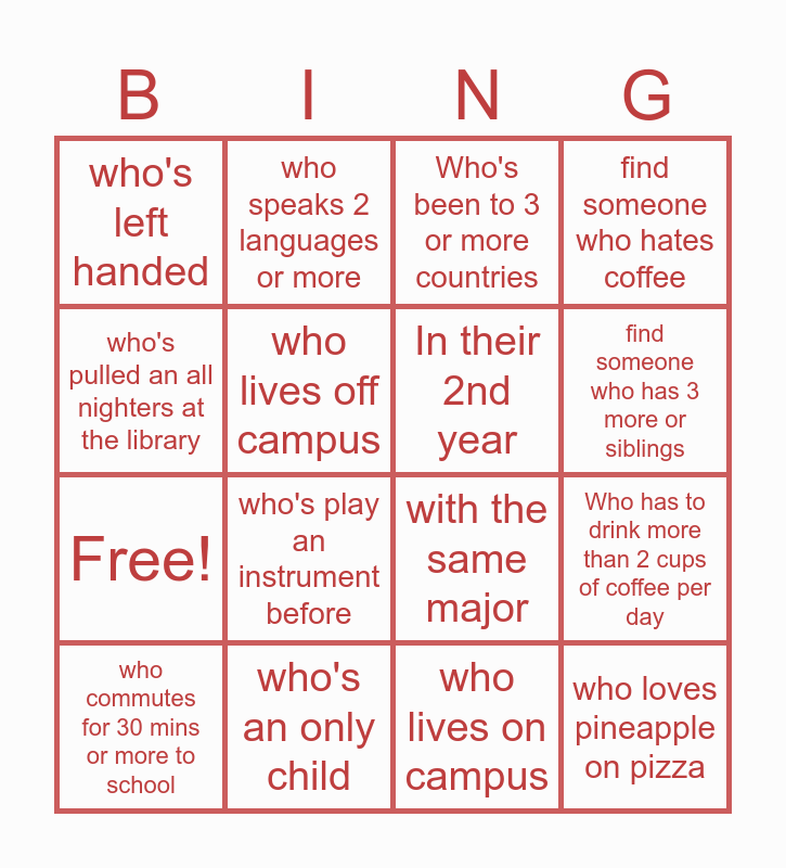 This bingo card has 19 words: with the same major, From the same home country as you, Who's been to 3 or more countries, who loves pineapple on pizza, Who has to drink more than 2 cups of coffee per day, who's pulled an all nighters at the library, who lives on campus, who's left handed, who speaks 2 languages or more, Free!, who's play an instrument before, who lives off campus, In their 2nd year, who's an only child, who commutes for 30 mins or more to school, who has changed their majors at least once, find someone who hates coffee, find someone who has 3 more or siblings and find someone who's doing a co-op/internship.