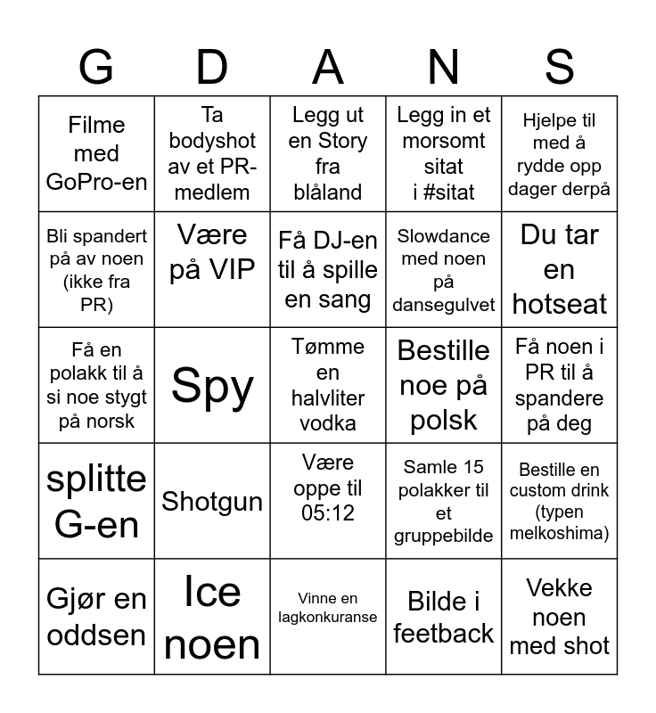 This bingo card has 25 words: Shotgun, Vinne en lagkonkuranse, Få DJ-en til å spille en sang, Gjør en oddsen, Hjelpe til med å rydde opp dager derpå, Filme med GoPro-en, Bli spandert på av noen (ikke fra PR), Ta bodyshot av et PR-medlem, Bestille noe på polsk, Være oppe til 05:12, Slowdance med noen på dansegulvet, Få en polakk til å si noe stygt på norsk, Samle 15 polakker til et gruppebilde, Bestille en custom drink (typen melkoshima), Være på VIP, Vekke noen med shot, Få noen i PR til å spandere på deg, Legg ut en Story fra blåland, Du tar en hotseat, Spy, Tømme en halvliter vodka, Ice noen, splitte G-en, Legg in et morsomt sitat i #sitat and Bilde i feetback.