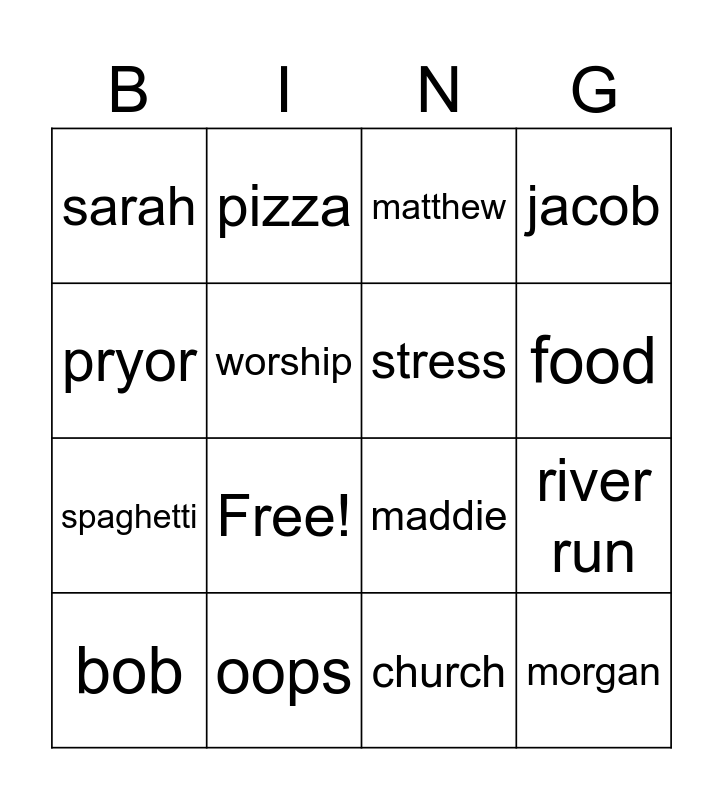 This bingo card has 18 words: Free!, morgan, matthew, sarah, maddie, jacob, bob, pizza, food, spaghetti, church, pryor, river run, worship, stress, scary, oops and money.