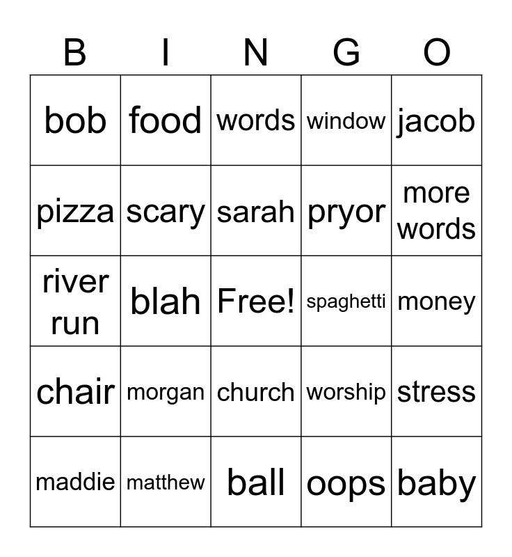 This bingo card has a free space and 24 words: morgan, matthew, sarah, maddie, jacob, bob, pizza, food, spaghetti, church, pryor, river run, worship, stress, scary, oops, money, words, more words, blah, baby, chair, window and ball.