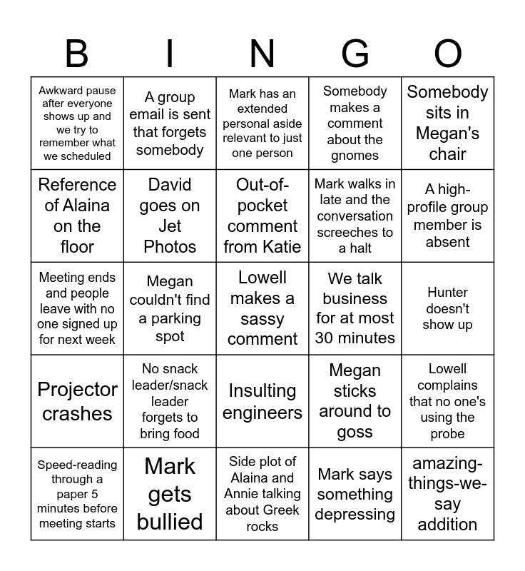 This bingo card has a free space and 24 words: No snack leader/snack leader forgets to bring food, Mark gets bullied, Out-of-pocket comment from Katie, Speed-reading through a paper 5 minutes before meeting starts, Somebody sits in Megan's chair, Awkward pause after everyone shows up and we try to remember what we scheduled, Reference of Alaina on the floor, A group email is sent that forgets somebody, We talk business for at most 30 minutes, Insulting engineers, Mark walks in late and the conversation screeches to a halt, Meeting ends and people leave with no one signed up for next week, Megan sticks around to goss, Lowell complains that no one's using the probe, David goes on Jet Photos, Mark says something depressing, Hunter doesn't show up, Mark has an extended personal aside relevant to just one person, A high-profile group member is absent, Megan couldn't find a parking spot, amazing-things-we-say addition, Projector crashes, Somebody makes a comment about the gnomes and Side plot of Alaina and Annie talking about Greek rocks.
