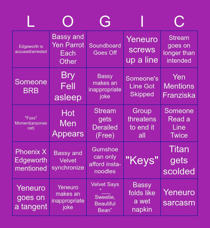 This bingo card has a free space and 35 words: Bassy yells for no reason, Bassy dyslexic moment, Velvet reels the group back in, Bry Fell asleep, Gumshoe can only afford insta- noodles, Yeneuro screws up a line, Someone BRB, Velvet screws up a line, Bassy makes an inappropriate joke, "Editor" mentioned, "Fuss" Moment(anyones cat), Stream goes on longer than intended, AA Logic VS RL Logic, Group gets stuck on a Easy puzzle, Edgeworth is accused/arrested, Group threatens to end it all, Bassy folds like a wet napkin, Hot Men Appears, Phoenix X Edgeworth mentioned, Yeneuro sarcasm, "Keys", Yeneuro goes on a tangent, Titan gets scolded, Yeneuro makes an inappropriate joke, Soundboard Goes Off, Yen Mentions Franziska, Oldbag Kills Yeneuro, Runaway Dialogue (OLDBAG DOESN'T COUNT!), Someone's Line Got Skipped, Someone Read a Line Twice, Bry Said Something out of Pocket, Velvet Says "___ Sweetie, Beautiful Bean”, Bassy and Velvet synchronize, Bassy and Yen Parrot Each Other and Someone Tries to Die Via Laughter.