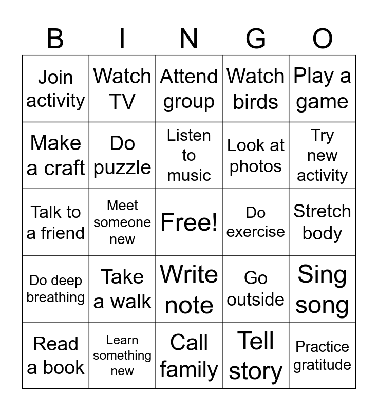This bingo card has a free space and 25 words: Take a walk, Call family, Listen to music, Read a book, Play a game, Join activity, Make a craft, Watch TV, Do exercise, Write note, Look at photos, Talk to a friend, Go outside, Sing song, Do puzzle, Share memory, Stretch body, Attend group, Try new activity, Meet someone new, Practice gratitude, Learn something new, Do deep breathing, Watch birds and Tell story.