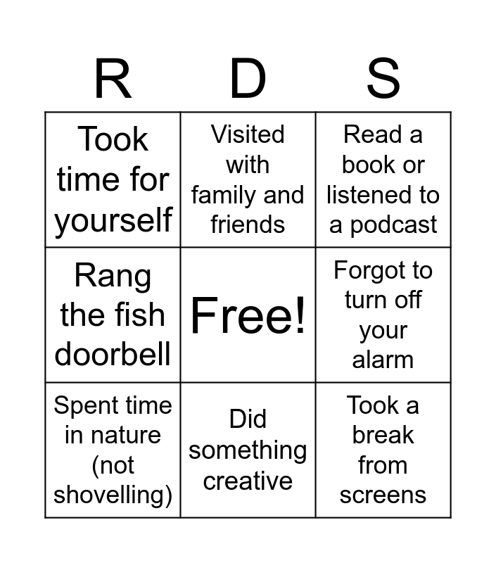 This bingo card has a free space and 8 words: Forgot to turn off your alarm, Read a book or listened to a podcast, Visited with family and friends, Spent time in nature (not shovelling), Took time for yourself, Took a break from screens, Rang the fish doorbell and Did something creative.