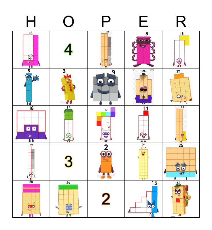 This bingo card has 30 images and 5 words: 1, 2, 3, 4 and 5.