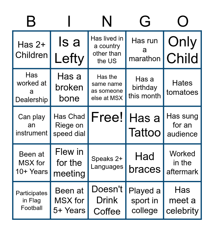 This bingo card has a free space and 24 words: Flew in for the meeting, Been at MSX for 5+ Years, Has the same name as someone else at MSX, Participates in Flag Football, Only Child, Has 2+ Children, Has worked at a Dealership, Is a Lefty, Has a Tattoo, Speaks 2+ Languages, Has a birthday this month, Can play an instrument, Had braces, Worked in the aftermark, Has a broken bone, Played a sport in college, Has sung for an audience, Has lived in a country other than the US, Hates tomatoes, Has Chad Riege on speed dial, Has meet a celebrity, Been at MSX for 10+ Years, Has run a marathon and Doesn't Drink Coffee.