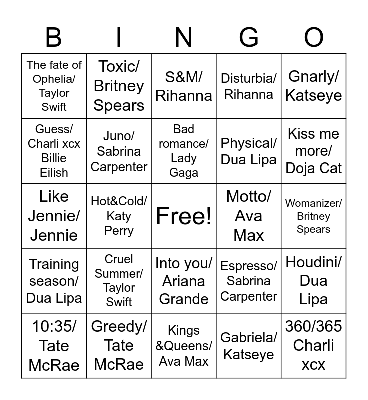 This bingo card has a free space and 24 words: 10:35/ Tate McRae, Cruel Summer/ Taylor Swift, Bad romance/ Lady Gaga, Gabriela/ Katseye, Gnarly/ Katseye, The fate of Ophelia/ Taylor Swift, Toxic/ Britney Spears, S&M/ Rihanna, Motto/ Ava Max, Womanizer/ Britney Spears, Like Jennie/ Jennie, Juno/ Sabrina Carpenter, Espresso/ Sabrina Carpenter, Houdini/ Dua Lipa, Guess/ Charli xcx Billie Eilish, Greedy/ Tate McRae, Kings &Queens/ Ava Max, Disturbia/ Rihanna, Kiss me more/ Doja Cat, Training season/ Dua Lipa, Hot&Cold/ Katy Perry, Into you/ Ariana Grande, Physical/ Dua Lipa and 360/365 Charli xcx.
