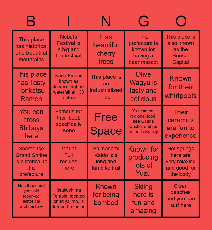 This bingo card has a free space and 24 words: Mount Fuji resides here, Itsukushima Temple, located on Miyajima, is fun and popular, This place is an industrialized hub, Has thousand year-old reserved historical architecture, This place is also known as the Bonsai Capital, This place has historical and beautiful mountains, This place has Tasty Tonkatsu Ramen, Nebuta Festival is a big and fun festival, You can eat regional food, see Osaka Castle, and go to the lively city, Shimanami Kaido is a long and fun bike trail, Olive Wagyu is tasty and delicious, You can cross Shibuya here, Known for producing lots of Yuzu, Hot springs here are very relaxing and good for the body, Nachi Falls is known as Japan’s highest waterfall at 133 meters, Skiing here is fun and amazing, Their ceramics are fun to experience, Has beautiful cherry trees, Known for their whirlpools, Famous for their beef, specifically Kobe, Clean beaches and you can surf here, Sacred Ise Grand Shrine is historical to this prefecture, This prefecture is known for having a bear mascot and Known for being bombed.