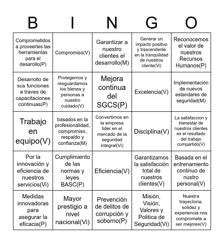 This bingo card has 25 words: Cumplimiento de las normas y leyes BASC(P), Prevención de delitos de corrupción y soborno(P), Mejora continua del SGCS(P), Medidas innovadoras para asegurar la eficacia(P), Reconocemos el valor de nuestros Recursos Humanos(P), Comprometidos a proveerles las herramientas para el desarollo(P), Desarrollo de sus funciones a traves de capacitaciones continuas(P), Compromiso(V), Disciplina(V), Eficiencia(V), Excelencia(V), Trabajo en equipo(V), Garantizamos la satisfacción total de nuestros clientes(V), Basada en el entrenamiento continuo de nustro personal(V), Protegemos y resguardamos los bienes y personas a nuestro cuidado(V), Nuestra trayectoria, solidez y experiencia nos compromete a ser mejores(V), La satisfaccion y bienestar de nuestros clientes es el resultado del trabajo compartido(V), Garantizar a nuestro clientes el desarrollo(M), Implementación de nuevos estandares de seguridad(M), basados en la profesionalidad, compromiso, respaldo y confianza(M), Convertirnos en la empresa lider en el mercado de la seguridad integral(Vi), Mayor prestigio a nivel nacional(Vi), Por la innovación y eficiencia de nuestros servicios(Vi), Generar un impacto positivo y trascendente en la tranquilidad de nuestros cliente(Vi) and Misión, Visión, Valores y Politica de Seguridad(Vi).