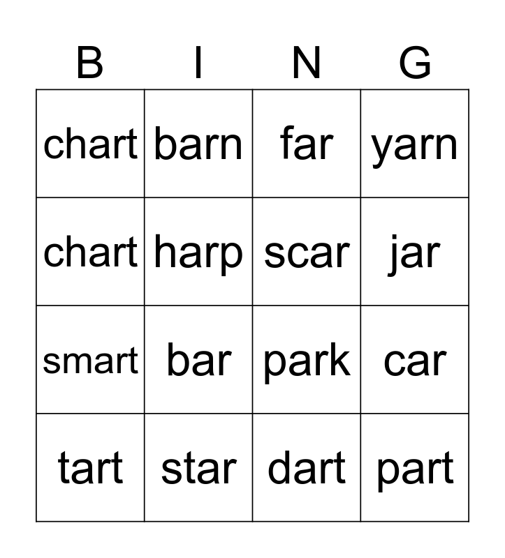 This bingo card has 16 words: star, car, far, chart, smart, barn, park, dart, chart, harp, tart, yarn, bar, jar, scar and part.