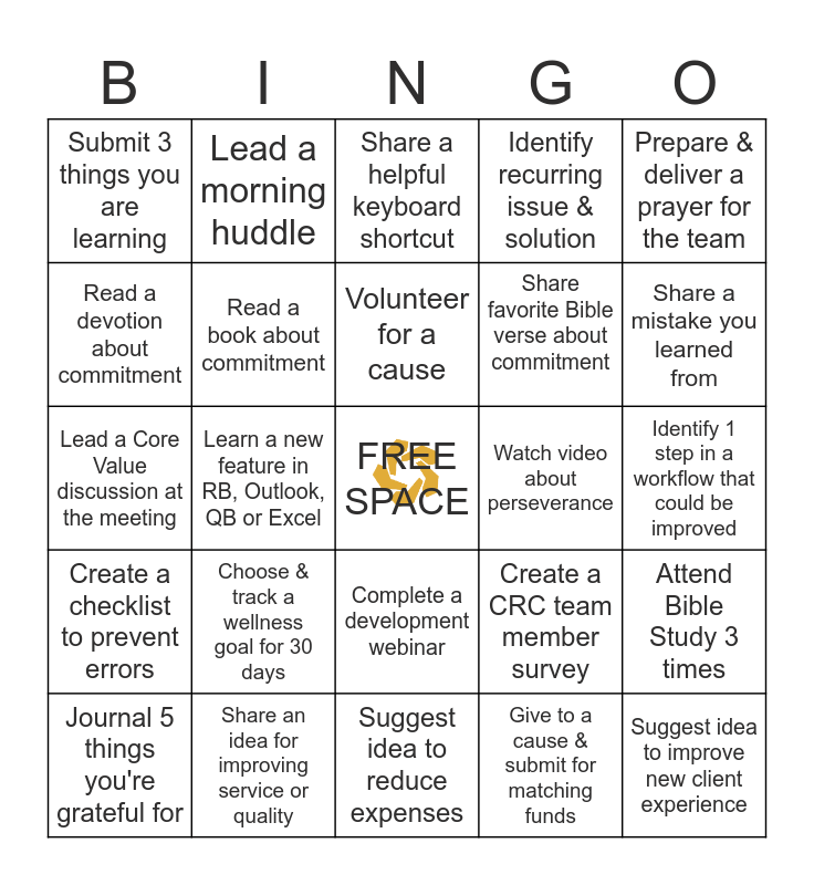 This bingo card has a free space and 24 words: Choose & track a wellness goal for 30 days, Share an idea for improving service or quality, Volunteer for a cause, Journal 5 things you're grateful for, Prepare & deliver a prayer for the team, Submit 3 things you are learning, Read a devotion about commitment, Lead a morning huddle, Watch video about perseverance, Complete a development webinar, Share favorite Bible verse about commitment, Lead a Core Value discussion at the meeting, Create a CRC team member survey, Attend Bible Study 3 times, Read a book about commitment, Give to a cause & submit for matching funds, Identify 1 step in a workflow that could be improved, Share a helpful keyboard shortcut, Share a mistake you learned from, Learn a new feature in RB, Outlook, QB or Excel, Suggest idea to improve new client experience, Create a checklist to prevent errors, Identify recurring issue & solution and Suggest idea to reduce expenses.