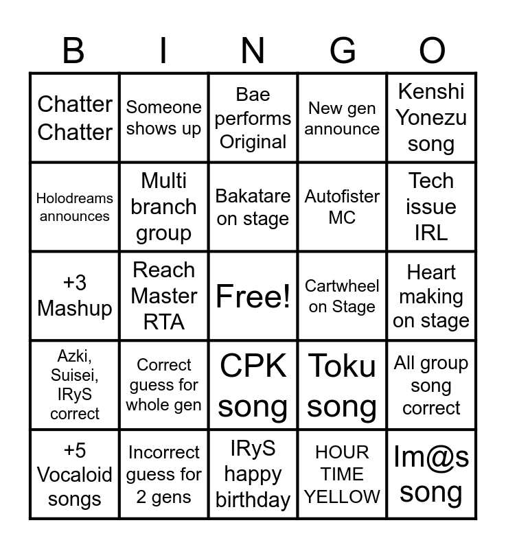 This bingo card has a free space and 24 words: Correct guess for whole gen, Incorrect guess for 2 gens, Bakatare on stage, +5 Vocaloid songs, Kenshi Yonezu song, Chatter Chatter, Holodreams announces, Someone shows up, Cartwheel on Stage, CPK song, Autofister MC, +3 Mashup, Toku song, All group song correct, Multi branch group, HOUR TIME YELLOW, Heart making on stage, Bae performs Original, Tech issue IRL, Reach Master RTA, Im@s song, Azki, Suisei, IRyS correct, New gen announce and IRyS happy birthday.
