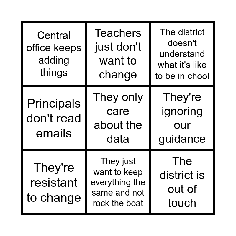 This bingo card has 9 words: They're resistant to change, The district doesn't understand what it's like to be in chool, Teachers just don't want to change, Principals don't read emails, Central office keeps adding things, They're ignoring our guidance, They only care about the data, The district is out of touch and They just want to keep everything the same and not rock the boat.