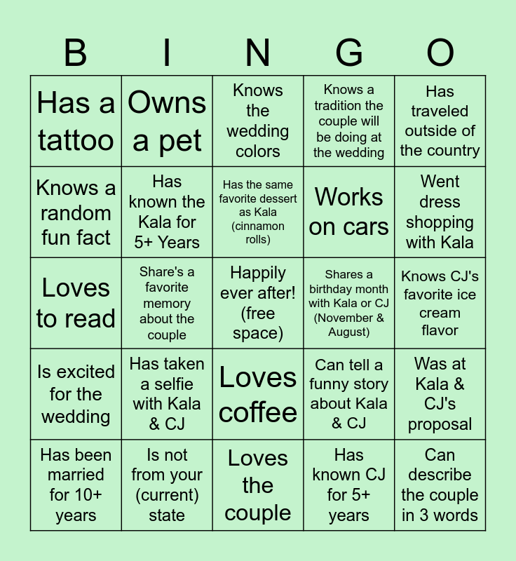 This bingo card has a free space and 24 words: Has taken a selfie with Kala & CJ, Is not from your (current) state, Has the same favorite dessert as Kala (cinnamon rolls), Has been married for 10+ years, Has traveled outside of the country, Has a tattoo, Knows a random fun fact, Owns a pet, Shares a birthday month with Kala or CJ (November & August), Loves coffee, Works on cars, Loves to read, Can tell a funny story about Kala & CJ, Was at Kala & CJ's proposal, Has known the Kala for 5+ Years, Has known CJ for 5+ years, Knows CJ's favorite ice cream flavor, Knows the wedding colors, Went dress shopping with Kala, Share's a favorite memory about the couple, Can describe the couple in 3 words, Is excited for the wedding, Knows a tradition the couple will be doing at the wedding and Loves the couple.