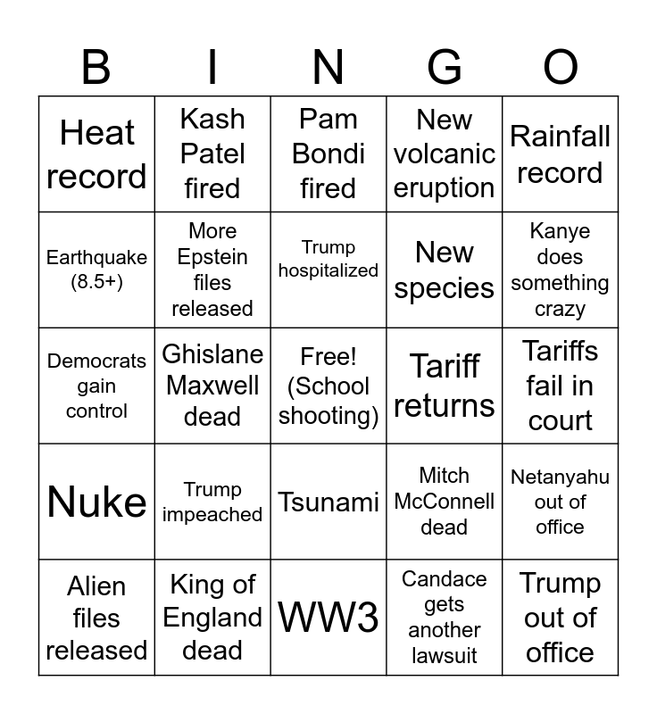 This bingo card has a free space and 24 words: Trump impeached, King of England dead, Trump hospitalized, Alien files released, Rainfall record, Heat record, Earthquake (8.5+), Kash Patel fired, Tariff returns, Tsunami, New species, Democrats gain control, Mitch McConnell dead, Netanyahu out of office, More Epstein files released, Candace gets another lawsuit, Tariffs fail in court, Pam Bondi fired, Kanye does something crazy, Ghislane Maxwell dead, Trump out of office, Nuke, New volcanic eruption and WW3.