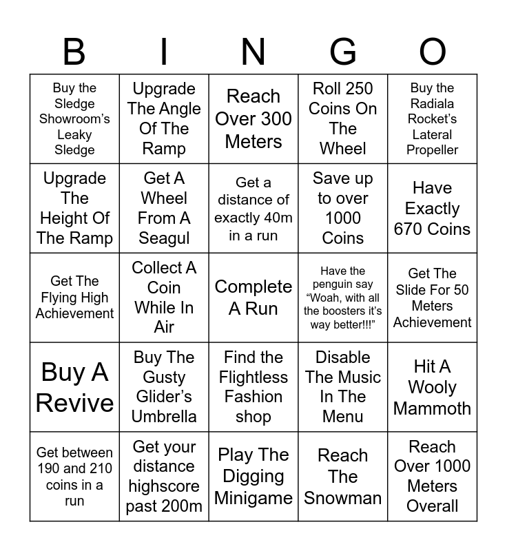 This bingo card has a free space and 24 words: Buy The Gusty Glider’s Umbrella, Get your distance highscore past 200m, Get a distance of exactly 40m in a run, Get between 190 and 210 coins in a run, Buy the Radiala Rocket’s Lateral Propeller, Buy the Sledge Showroom’s Leaky Sledge, Upgrade The Height Of The Ramp, Upgrade The Angle Of The Ramp, Have the penguin say “Woah, with all the boosters it’s way better!!!”, Find the Flightless Fashion shop, Save up to over 1000 Coins, Get The Flying High Achievement, Disable The Music In The Menu, Hit A Wooly Mammoth, Get A Wheel From A Seagul, Reach The Snowman, Get The Slide For 50 Meters Achievement, Reach Over 300 Meters, Have Exactly 670 Coins, Collect A Coin While In Air, Reach Over 1000 Meters Overall, Buy A Revive, Roll 250 Coins On The Wheel and Play The Digging Minigame.