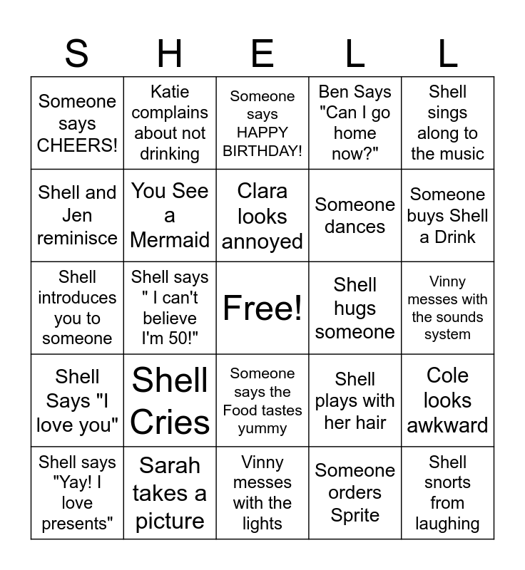 This bingo card has a free space and 29 words: Shell says "Yay! I love presents", Shell says "It's my Birthday!", Shell says " I can't believe I'm 50!", Something falls off Shell's Costume, Someone says CHEERS!, Someone says HAPPY BIRTHDAY!, You See a Mermaid, Shell Cries, Shell hugs someone, Sarah takes a picture, Vinny messes with the sounds system, Shell snorts from laughing, Vinny messes with the lights, Someone orders Sprite, Someone buys Shell a Drink, You see a seashell, Someone says the Food tastes yummy, Shell Says "I love you", Shell sings along to the music, Shell introduces you to someone, Shell plays with her hair, You See something Sparkly, Someone dances, Shell and Jen reminisce, Ben Says "Can I go home now?", Katie complains about not drinking, Cole looks awkward, Clara looks annoyed and Jenny says "love you big".