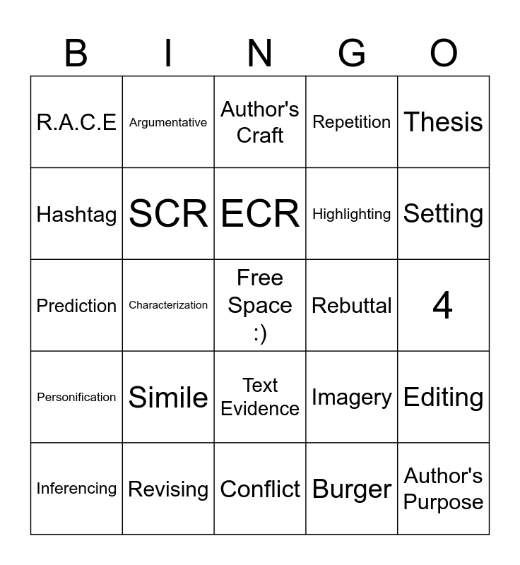 This bingo card has a free space and 24 words: Simile, Revising, ECR, Inferencing, Thesis, R.A.C.E, Hashtag, Argumentative, Rebuttal, Text Evidence, Highlighting, Prediction, Imagery, Editing, SCR, Burger, 4, Author's Craft, Setting, Characterization, Author's Purpose, Personification, Repetition and Conflict.