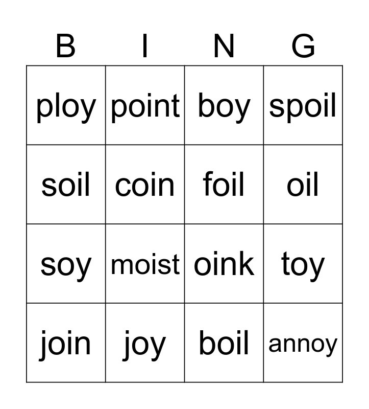 This bingo card has 16 words: joy, toy, boy, ploy, soy, point, oink, boil, soil, coin, join, spoil, moist, oil, foil and annoy.