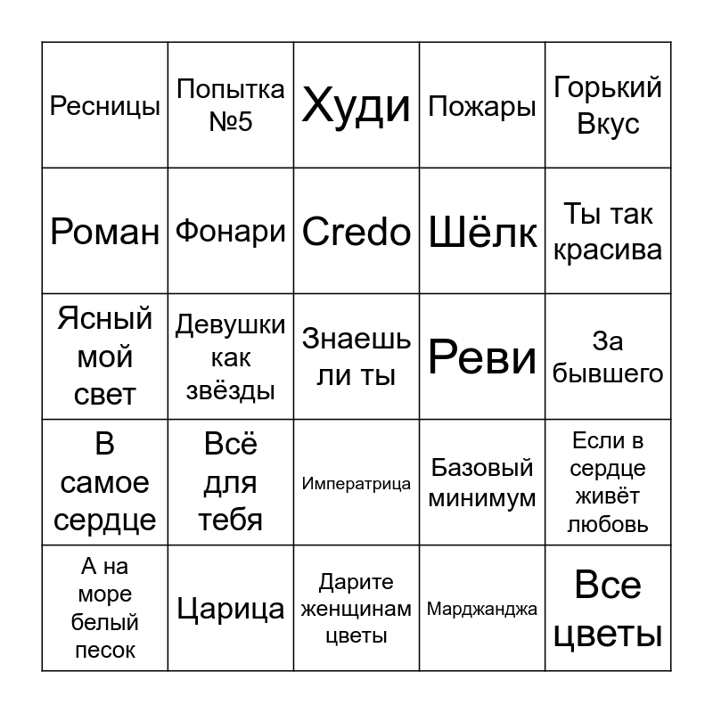 This bingo card has 30 words: Царица, Улетаю, Девушки как звёзды, Как быть, Ресницы, Худи, Фонари, Императрица, Реви, Дарите женщинам цветы, За бывшего, Знаешь ли ты, Марджанджа, Все цветы, Ты так красива, Чёрная смородина, Базовый минимум, В самое сердце, Всё для тебя, Горький Вкус, Ясный мой свет, Одного, Попытка №5, Шёлк, Роман, Пожары, Если в сердце живёт любовь, А на море белый песок, Credo and Я за тебя умру.