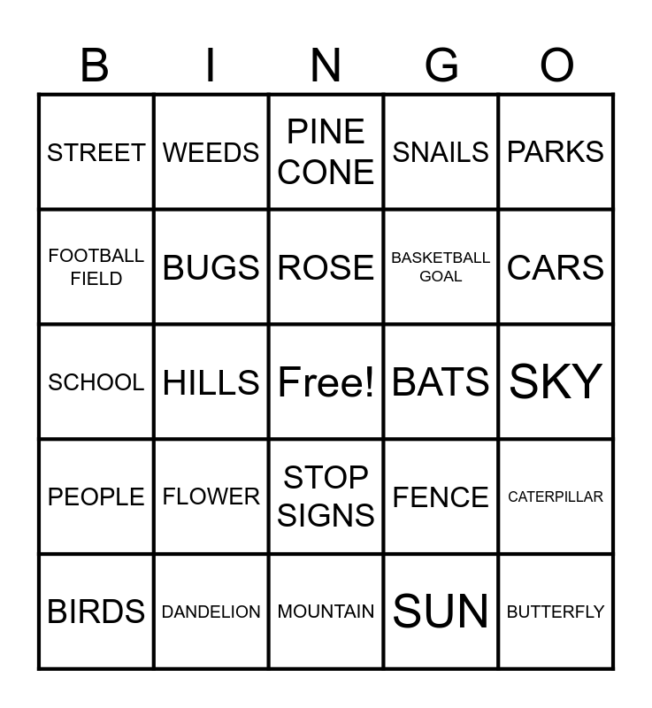 This bingo card has a free space and 29 words: BIRDS, TRUCKS, HILLS, TWIGS, STREET, PINE CONE, BUGS, FLOWER, BATS, DANDELION, SKY, BUTTERFLY, MOUNTAIN, SUN, CARS, MOON, STOP SIGNS, PEOPLE, PARKS, SCHOOL, FENCE, ACCORN, BASKETBALL GOAL, FOOTBALL FIELD, SNAILS, WEEDS, CATERPILLAR, ROSE and TRAILS.