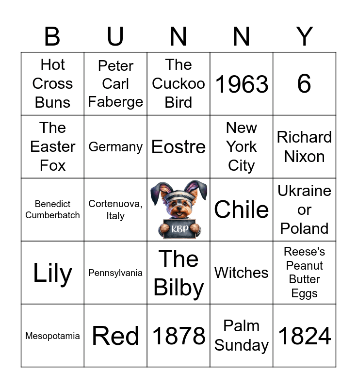 This bingo card has a free space and 30 words: Red, Eggs (along with meat & dairy products), Cortenuova, Italy, 15,873, Hot Cross Buns, The Cuckoo Bird, Germany, The Bilby, Chile, 1878, Ukraine or Poland, 1824, Palm Sunday, Lent, Richard Nixon, 27, Witches, Lily, Pennsylvania, 6, Benedict Cumberbatch, Mardi Gras, Peter Carl Faberge, New York City, The Easter Fox, 1963, Reese's Peanut Butter Eggs, Mesopotamia, Eostre and 30 Pieces of Silver.