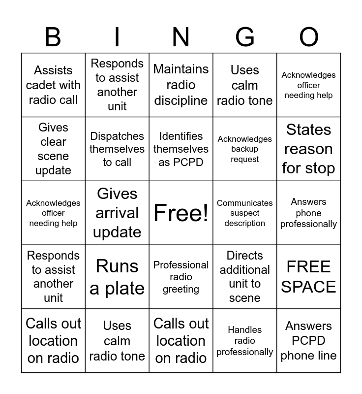 This bingo card has a free space and 48 words: Acknowledges backup request, Answers PCPD phone line, States reason for stop, Calls out location on radio, Runs a plate, Professional radio greeting, Responds to assist another unit, Uses proper call sign, Gives clear scene update, Calls out traffic stop location, Dispatches themselves to call, Uses calm radio tone, FREE SPACE, Directs additional unit to scene, Answers phone professionallyRequests additional unit properly, Confirms en route, Identifies themselves as PCPD, Communicates suspect description, Maintains radio disciplineProvides clear reason for stop, Acknowledges officer needing help, Gives arrival update, Handles radio professionally, Assists cadet with radio call, Acknowledges backup request, Answers PCPD phone line, States reason for stop, Calls out location on radio, Runs a plate, Professional radio greeting, Responds to assist another unit, Uses proper call sign, Gives clear scene update, Calls out traffic stop location, Dispatches themselves to call, Uses calm radio tone, Handcuffs a Suspect, Directs additional unit to scene, Answers phone professionally, Requests additional unit properly, Confirms en route, Identifies themselves as PCPD, Communicates suspect description, Maintains radio discipline, Provides clear reason for stop, Acknowledges officer needing help, Gives arrival update, Handles radio professionally and Assists cadet with radio call.