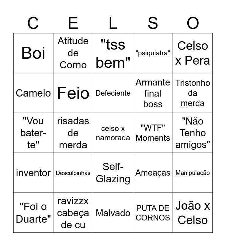 This bingo card has 25 words: Desculpinhas, Malvado, Defeciente, "Foi o Duarte", Celso x Pera, Boi, Camelo, Atitude de Corno, "WTF" Moments, Self-Glazing, Armante final boss, "Vou bater-te", Ameaças, Manipulação, Feio, João x Celso, "Não Tenho amigos", "tss bem", Tristonho da merda, risadas de merda, celso x namorada, ravizzx cabeça de cu, inventor, "psiquiatra" and PUTA DE CORNOS.