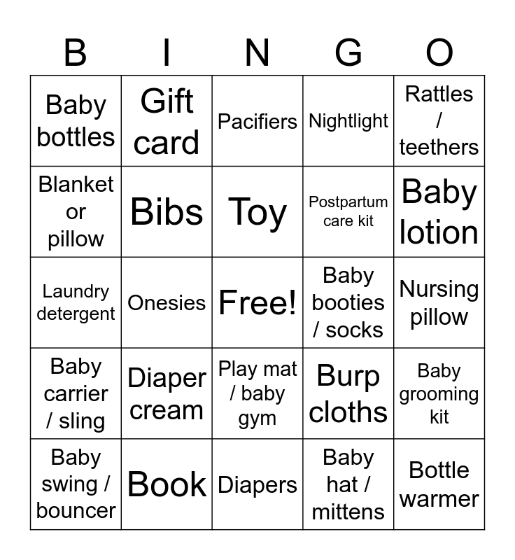 This bingo card has a free space and 31 words: Diapers, Wipes, Onesies, Swaddle blankets, Baby bottles, Pacifiers, Bibs, Burp cloths, Baby booties / socks, Baby hat / mittens, Nursing pillow, Bottle warmer, Formula, Baby bath items, Baby lotion, Baby medicine kit, Baby grooming kit, Diaper cream, Baby carrier / sling, Play mat / baby gym, Rattles / teethers, Stuffed animal, Baby swing / bouncer, Gift card, Postpartum care kit, Blanket or pillow, Nightlight, Laundry detergent, Book, Toy and Headband / bow.
