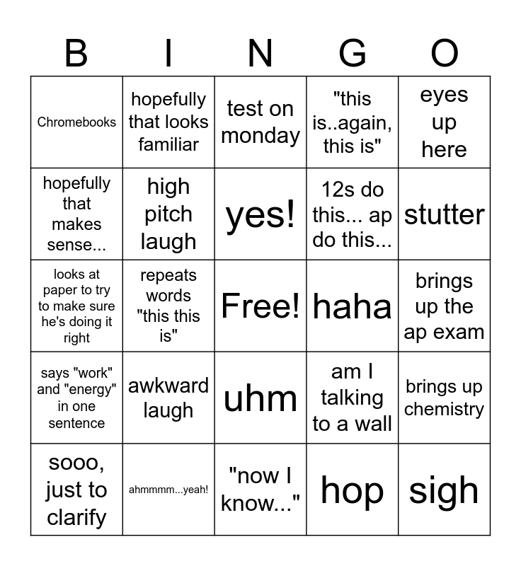 This bingo card has a free space and 24 words: awkward laugh, ahmmmm...yeah!, yes!, sooo, just to clarify, eyes up here, Chromebooks, hopefully that makes sense..., hopefully that looks familiar, haha, uhm, 12s do this... ap do this..., looks at paper to try to make sure he's doing it right, am I talking to a wall, brings up chemistry, high pitch laugh, hop, brings up the ap exam, test on monday, stutter, repeats words "this this is", sigh, says "work" and "energy" in one sentence, "this is..again, this is" and "now I know...".