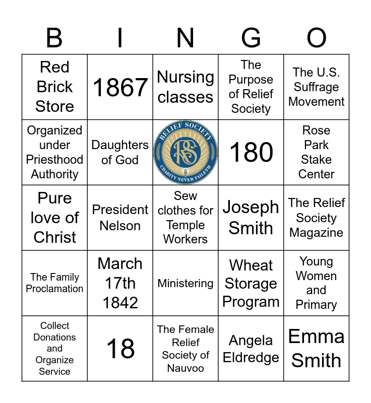 This bingo card has 1 images and 24 words: March 17th 1842, The Female Relief Society of Nauvoo, Collect Donations and Organize Service, The U.S. Suffrage Movement, Red Brick Store, Organized under Priesthood Authority, 1867, Joseph Smith, Ministering, 180, Pure love of Christ, Wheat Storage Program, Young Women and Primary, Daughters of God, Emma Smith, The Relief Society Magazine, Nursing classes, Rose Park Stake Center, President Nelson, Sew clothes for Temple Workers, 18, The Family Proclamation, The Purpose of Relief Society and Angela Eldredge.
