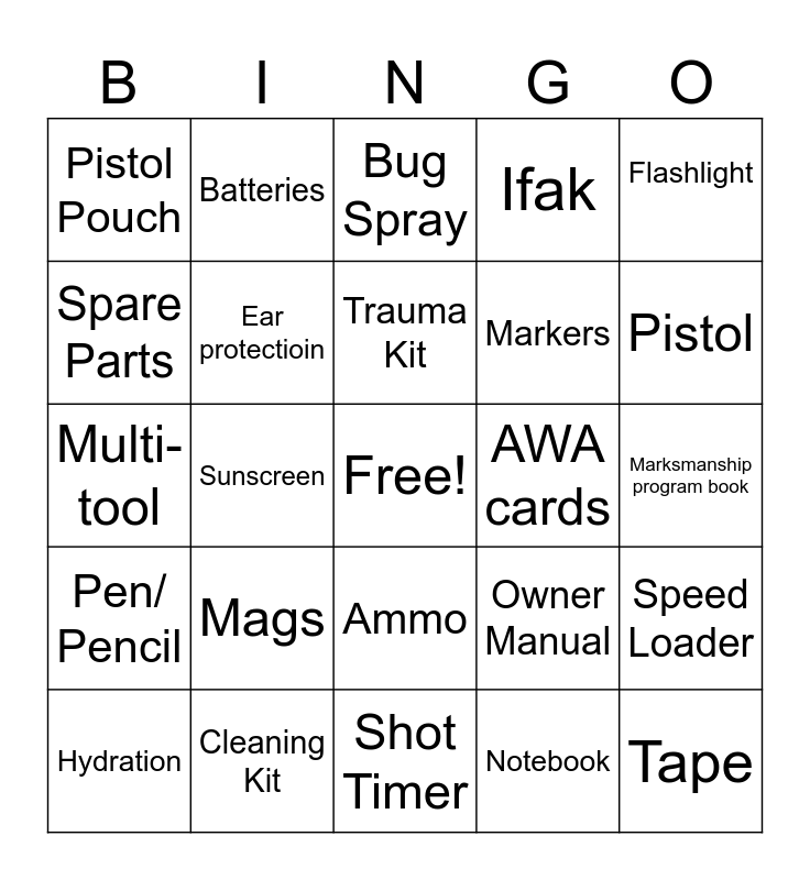 This bingo card has a free space and 24 words: Mags, Cleaning Kit, Trauma Kit, Hydration, Flashlight, Pistol Pouch, Spare Parts, Batteries, AWA cards, Ammo, Markers, Multi-tool, Owner Manual, Speed Loader, Ear protectioin, Notebook, Marksmanship program book, Bug Spray, Pistol, Sunscreen, Tape, Pen/ Pencil, Ifak and Shot Timer.