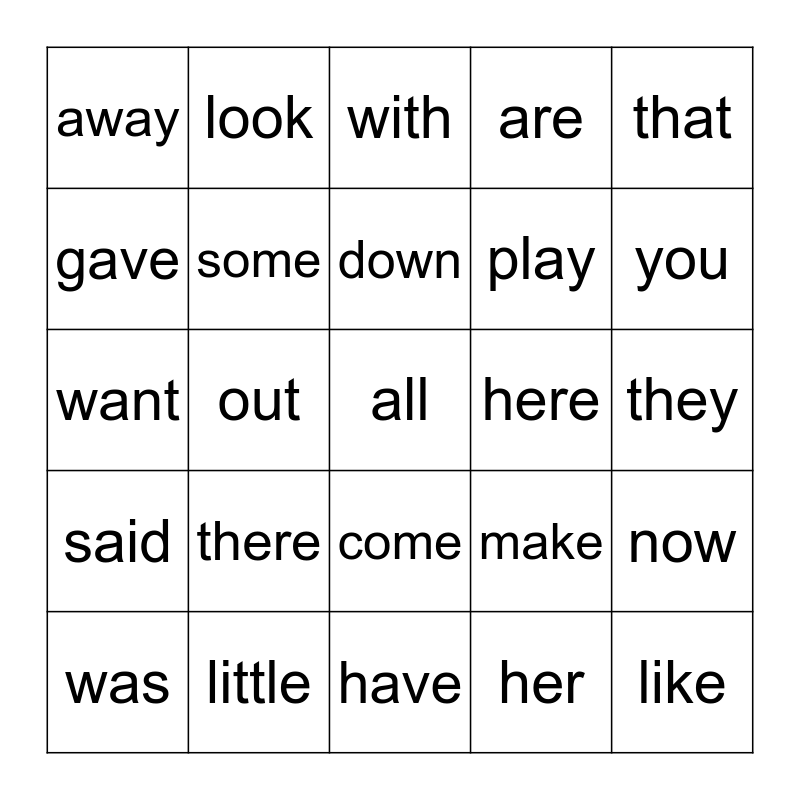 This bingo card has a free space and 24 words: there, little, down, was, that, away, gave, look, here, come, play, want, make, now, some, her, they, with, you, out, like, said, are and have.