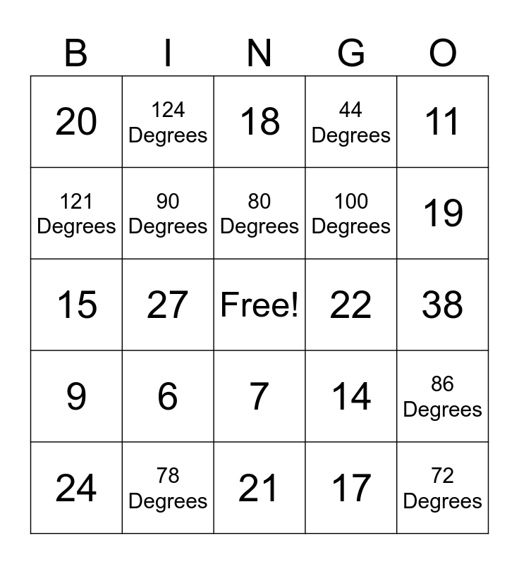 This bingo card has a free space and 29 words: 24, 13, 27, 30, 20, 18, 90 Degrees, 6, 22, 78 Degrees, 38, 72 Degrees, 21, 17, 19, 5, 7, 9, 11, 15, 14, 23, 100 Degrees, 121 Degrees, 44 Degrees, 124 Degrees, 86 Degrees, 80 Degrees and 46.