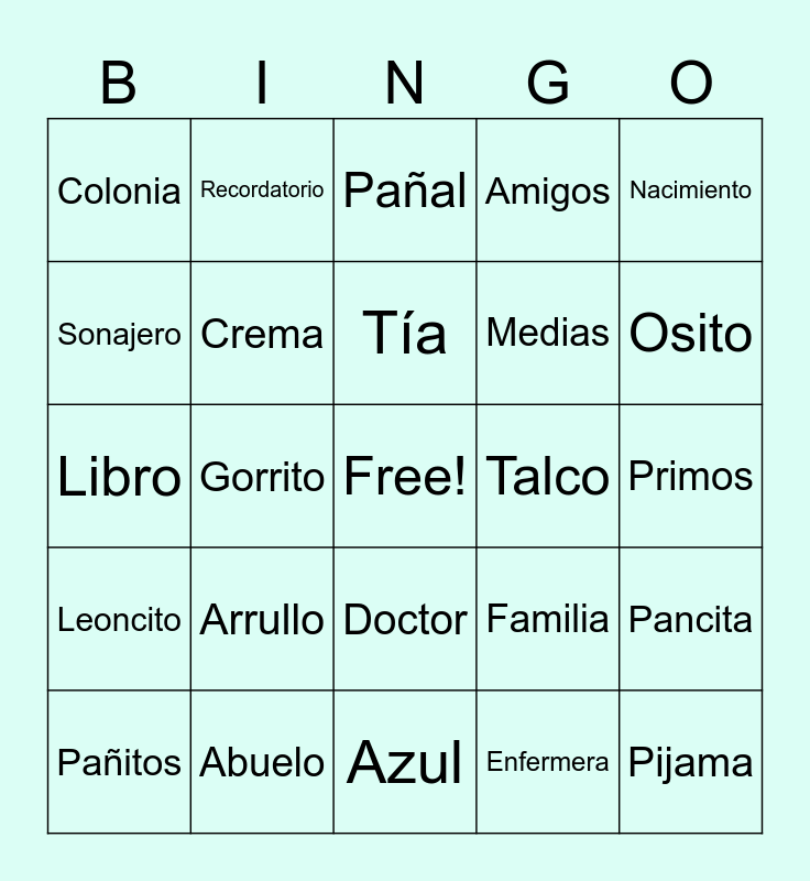This bingo card has a free space and 84 words: Lorenzo, Bebé, Pañal, Tetero, Chupón, Babero, Cobija, Mantita, Coche, Cuna, Moisés, Bañera, Crema, Talco, Shampoo, Colonia, Pañitos, Sonajero, Peluche, Juguete, Carrito, Medias, Pijama, Enterizo, Gorrito, Zapatitos, Pañalera, Cambiador, Termómetro, Leche, Arrullo, Nana, Cuento, Libro, Almohada, Manta, Azul, Animalitos, Osito, Leoncito, Nube, Estrellita, Luna, Arcoíris, Regalo, Sorpresa, Recordatorio, Bolsita, Bienvenida, Foto, Cámara, Familia, Amigos, Vale, Juan Da, Abuela, Abuelo, Tía, Tío, Primos, Padrinos, Bendición, Amor, Ternura, Felicidad, Alegría, Ilusión, Llegada, Nacimiento, Barriguita, Pancita, Embarazo, Hospital, Parto, Doctor, Enfermera, Ecografía, Pataditas, Antojos, Besitos, Abrazos, Risitas, Siesta and Canastilla.