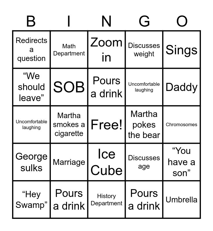 This bingo card has a free space and 26 words: Ice Cube, Pours a drink, Pours a drink, Pours a drink, Sings, Redirects a question, “We should leave”, Math Department, Chromosomes, Discusses age, Uncomfortable laughing, Uncomfortable laughing, “You have a son”, “Hey Swamp”, Martha smokes a cigarette, “Shut up.”, Discusses weight, George sulks, Zoom in, Umbrella, Daddy, History Department, Martha pokes the bear, Marriage, SOB and Inevitable.