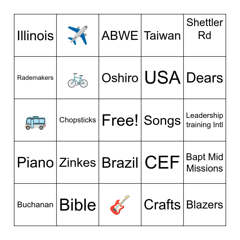 This bingo card has a free space and 24 words: Zinkes, Bible, Oshiro, Buchanan, Shettler Rd, Illinois, Rademakers, ✈️, Songs, Brazil, USA, 🚌, CEF, Bapt Mid Missions, 🚲, Crafts, Leadership training Intl, ABWE, Dears, Chopsticks, Blazers, Piano, Taiwan and 🎸.