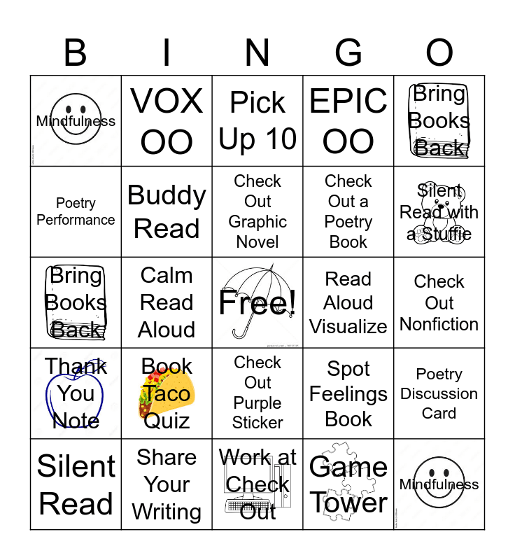 This bingo card has 9 images, a free space and 24 words: Book Taco Quiz, Share Your Writing, Check Out Graphic Novel, Silent Read, Bring Books Back, Mindfulness, Poetry Performance, VOX OO, Read Aloud Visualize, Check Out Purple Sticker, Check Out a Poetry Book, Bring Books Back, Spot Feelings Book, Poetry Discussion Card, Buddy Read, Game Tower, Check Out Nonfiction, Pick Up 10, Silent Read with a Stuffie, Calm Read Aloud, Mindfulness, Thank You Note, EPIC OO and Work at Check Out.