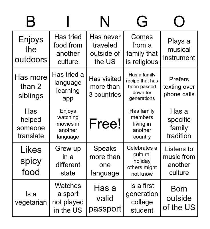 This bingo card has a free space and 24 words: Grew up in a different state, Watches a sport not played in the US, Has visited more than 3 countries, Is a vegetarian, Plays a musical instrument, Enjoys the outdoors, Has more than 2 siblings, Has tried food from another culture, Has family members living in another country, Speaks more than one language, Has a family recipe that has been passed down for generations, Has helped someone translate, Celebrates a cultural holiday others might not know, Listens to music from another culture, Has tried a language learning app, Is a first generation college student, Has a specific family tradition, Has never traveled outside of the US, Prefers texting over phone calls, Enjoys watching movies in another language, Born outside of the US, Likes spicy food, Comes from a family that is religious and Has a valid passport.