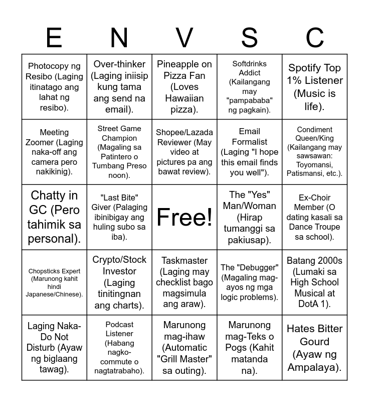 This bingo card has a free space and 24 words: Crypto/Stock Investor (Laging tinitingnan ang charts)., Podcast Listener (Habang nagko-commute o nagtatrabaho)., Shopee/Lazada Reviewer (May video at pictures pa ang bawat review)., Laging Naka-Do Not Disturb (Ayaw ng biglaang tawag)., Spotify Top 1% Listener (Music is life)., Photocopy ng Resibo (Laging itinatago ang lahat ng resibo)., Meeting Zoomer (Laging naka-off ang camera pero nakikinig)., Over-thinker (Laging iniisip kung tama ang send na email)., The "Yes" Man/Woman (Hirap tumanggi sa pakiusap)., Taskmaster (Laging may checklist bago magsimula ang araw)., Email Formalist (Laging "I hope this email finds you well")., Chatty in GC (Pero tahimik sa personal)., The "Debugger" (Magaling mag-ayos ng mga logic problems)., Batang 2000s (Lumaki sa High School Musical at DotA 1)., Street Game Champion (Magaling sa Patintero o Tumbang Preso noon)., Marunong mag-Teks o Pogs (Kahit matanda na)., Ex-Choir Member (O dating kasali sa Dance Troupe sa school)., Pineapple on Pizza Fan (Loves Hawaiian pizza)., Condiment Queen/King (Kailangang may sawsawan: Toyomansi, Patismansi, etc.)., "Last Bite" Giver (Palaging ibinibigay ang huling subo sa iba)., Hates Bitter Gourd (Ayaw ng Ampalaya)., Chopsticks Expert (Marunong kahit hindi Japanese/Chinese)., Softdrinks Addict (Kailangang may "pampababa" ng pagkain). and Marunong mag-ihaw (Automatic "Grill Master" sa outing)..
