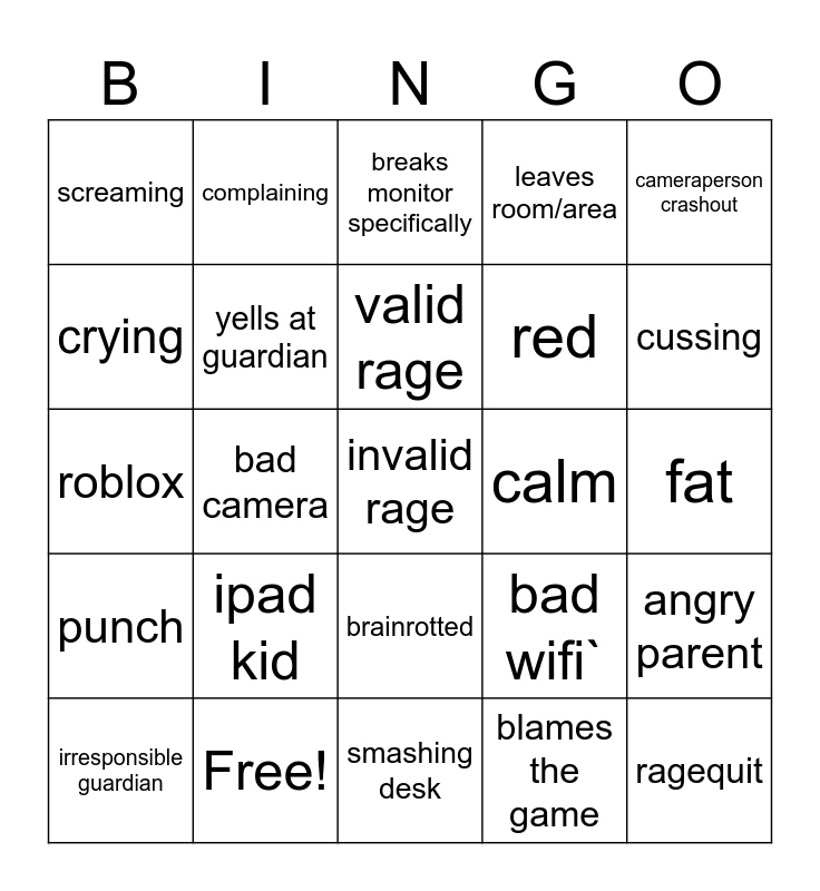 This bingo card has 28 words: angry parent, breaks something, red, blames the game, crying, breaks monitor specifically, complaining, punch, calm, irresponsible guardian, roblox, leaves room/area, Free!, smashing desk, cussing, fortnite, ipad kid, yells at guardian, valid rage, brainrotted, screaming, ragequit, invalid rage, bad camera, fat, bad wifi`, cameraperson crashout and minecraft.