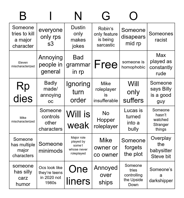 This bingo card has 36 words: Mike owner or co owner, Major role played by some1 whose never roleplayed, Annoyed over ships, Eleven mischaracterized, Mike mischaracterized, Mike roleplayer is insufferable, Annoying people in general, One liners, Someone disapears mid rp, Someone forgets the plot, Max played as constantly rude, Robin‘s only feature is being sarcastic, Overplay the babysitter Steve bit, Badly made/ annoying oc, Free, Someone tries to kill a major character, Someone has multiple major characters, Will only suffers, Rp dies, Dustin only makes jokes, Ignoring turn order, Someone controls other characters, No Hopper roleplayer, Will is weak, Lucas is turned into a bully, everyone only rps s3, someone is homophobic, Ocs look like they’re teens in 2020 not 1980s, Bad grammar in rp, Someones racist, Someone’s a darkshipper, someone has silly carz humor, Someone hasn’t watched Stranger things, Someone says Billy is a good guy, Someone minimods and Someone tries controlling the Upside Down.