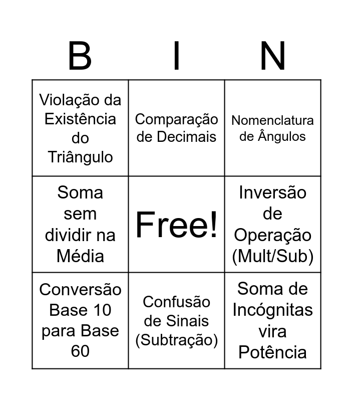 This bingo card has a free space and 24 words: Soma de Denominadores, O "Zero Mágico" na Vírgula, Confusão de Sinais (Subtração), Base vezes Expoente, Soma de Incógnitas vira Potência, Violação da Existência do Triângulo, Inversão de Operação (Mult/Sub), Comparação de Decimais, Raiz Distributiva na Soma, Cálculo Mental de Porcentagem, Hierarquia de Operações, Área confundida com Perímetro, O Erro Fatal do Binômio, Divisão, Conversão Base 10 para Base 60, Probabilidade acima de 1, Esquecer, Nomenclatura de Ângulos, Leitura de Frações, Arredondamento, Regra de 3 Inversa ignorada, Potência de Expoente Zero, Soma sem dividir na Média and Contagem de Vértices/Lados.