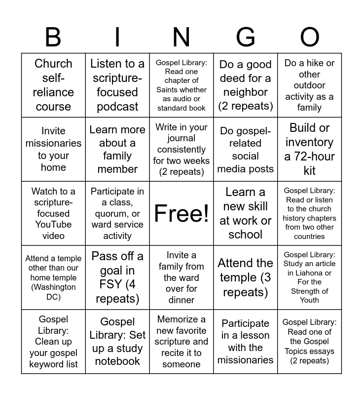 This bingo card has a free space and 36 words: Help index a cemetery for BillionGraves, Record an oral history interview with a family member, Memories on FamilySearch - make sure to share publicly if appropriate, Learn more about a family member, Attend the temple (3 repeats), Attend a temple other than our home temple (Washington DC), Write in your journal consistently for two weeks (2 repeats), Write a history of your parents or grandparents, Do a hike or other outdoor activity as a family, Do a service project found on Just Serve, Participate in a class, quorum, or ward service activity, Do a good deed for a neighbor (2 repeats), Take a First aid or CPR class, Learn a new skill at work or school, Build or inventory a 72-hour kit, Church self-reliance course, Make a meal you could do with no electricity, Pass off a goal in FSY (4 repeats), Gospel Library: Read one of the Gospel Topics essays (2 repeats), Gospel Library: Read one chapter of Saints whether as audio or standard book, Gospel Library: Read or listen to the church history chapters from two other countries, Gospel Library: Study an article in Liahona or For the Strength of Youth, Gospel Library: Set up a study notebook, Gospel Library: Clean up your gospel keyword list, Memorize a new favorite scripture and recite it to someone, Listen to a scripture-focused podcast, Watch to a scripture-focused YouTube video, Update your photo in LDS Tools, Do gospel-related social media posts, Invite missionaries to your home, Invite a friend to a meeting or activity (2 repeats), Share a gospel thought on social media, Participate in a lesson with the missionaries, Invite a family from the ward over for dinner, Invite a family from the ward over for dessert and Travel to a family history site.