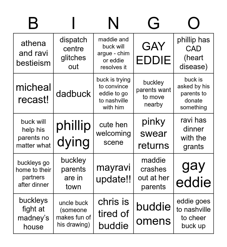 This bingo card has a free space and 24 words: buckley parents are in town, uncle buck (someone makes fun of his drawing), buck is trying to convince eddie to go to nashville with him, buckleys fight at madney’s house, phillip has CAD (heart disease), athena and ravi bestieism, micheal recast!, dispatch centre glitches out, pinky swear returns, mayravi update!!, buckley parents want to move nearby, buck will help his parents no matter what, maddie crashes out at her parents, gay eddie, dadbuck, buddie omens, ravi has dinner with the grants, maddie and buck will argue - chim or eddie resolves it, buck is asked by his parents to donate something, phillip dying, eddie goes to nashville to cheer buck up, buckleys go home to their partners after dinner, GAY EDDIE and chris is tired of buddie.