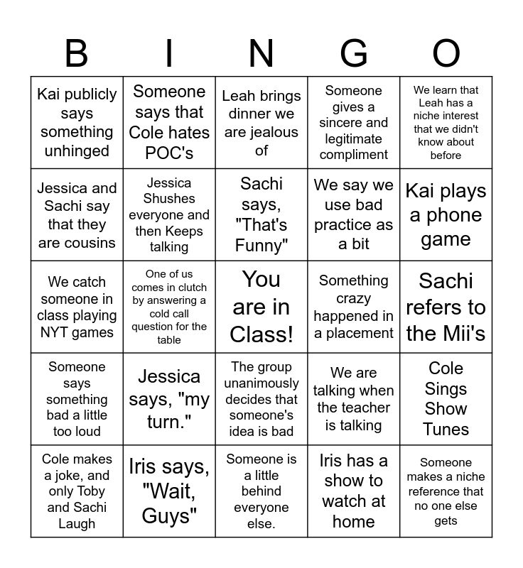 This bingo card has a free space and 24 words: Jessica says, "my turn.", Iris says, "Wait, Guys", Sachi says, "That's Funny", Cole makes a joke, and only Toby and Sachi Laugh, We learn that Leah has a niche interest that we didn't know about before, Kai publicly says something unhinged, Jessica and Sachi say that they are cousins, Someone says that Cole hates POC's, Something crazy happened in a placement, The group unanimously decides that someone's idea is bad, We say we use bad practice as a bit, We catch someone in class playing NYT games, We are talking when the teacher is talking, Cole Sings Show Tunes, Jessica Shushes everyone and then Keeps talking, Iris has a show to watch at home, Sachi refers to the Mii's, Leah brings dinner we are jealous of, Kai plays a phone game, One of us comes in clutch by answering a cold call question for the table, Someone makes a niche reference that no one else gets, Someone says something bad a little too loud, Someone gives a sincere and legitimate compliment and Someone is a little behind everyone else..