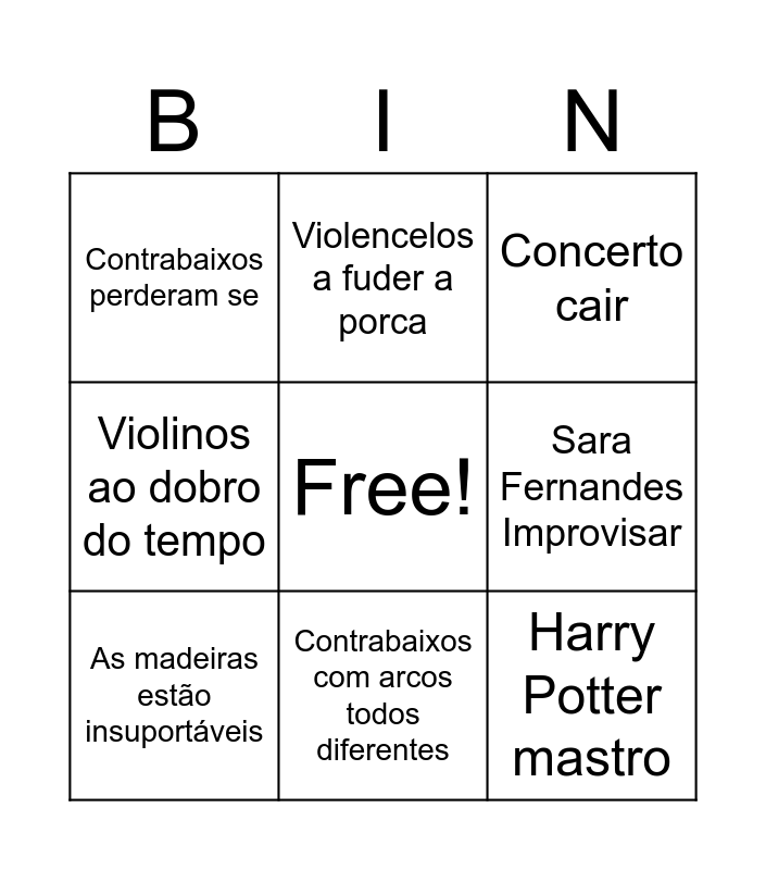 This bingo card has a free space and 8 words: Sara Fernandes Improvisar, Concerto cair, Violencelos a fuder a porca, As madeiras estão insuportáveis, Contrabaixos perderam se, Harry Potter mastro, Violinos ao dobro do tempo and Contrabaixos com arcos todos diferentes.