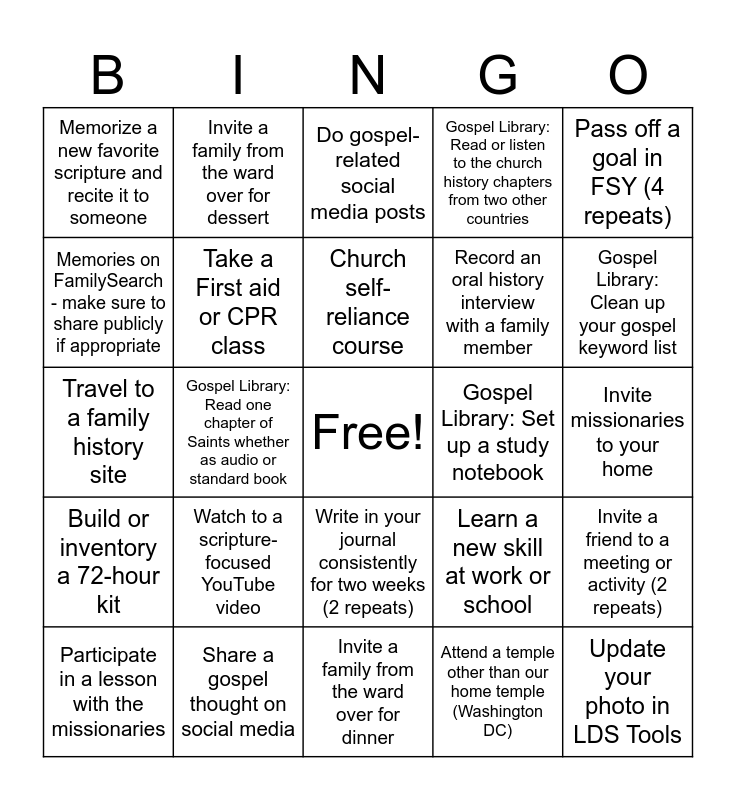 This bingo card has a free space and 36 words: Do a service project found on Just Serve, Participate in a class, quorum, or ward service activity, Do a good deed for a neighbor (2 repeats), Take a First aid or CPR class, Learn a new skill at work or school, Build or inventory a 72-hour kit, Church self-reliance course, Make a meal you could do with no electricity, Pass off a goal in FSY (4 repeats), Gospel Library: Read one of the Gospel Topics essays (2 repeats), Gospel Library: Read one chapter of Saints whether as audio or standard book, Gospel Library: Read or listen to the church history chapters from two other countries, Gospel Library: Study an article in Liahona or For the Strength of Youth, Gospel Library: Set up a study notebook, Gospel Library: Clean up your gospel keyword list, Memorize a new favorite scripture and recite it to someone, Listen to a scripture-focused podcast, Watch to a scripture-focused YouTube video, Update your photo in LDS Tools, Do gospel-related social media posts, Invite missionaries to your home, Invite a friend to a meeting or activity (2 repeats), Share a gospel thought on social media, Participate in a lesson with the missionaries, Invite a family from the ward over for dinner, Invite a family from the ward over for dessert, Travel to a family history site, Help index a cemetery for BillionGraves, Record an oral history interview with a family member, Memories on FamilySearch - make sure to share publicly if appropriate, Learn more about a family member, Attend the temple (3 repeats), Attend a temple other than our home temple (Washington DC), Write in your journal consistently for two weeks (2 repeats), Write a history of your parents or grandparents and Do a hike or other outdoor activity as a family.
