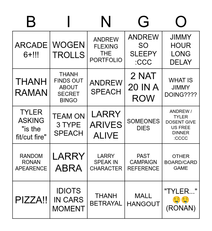 This bingo card has a free space and 24 words: LARRY ABRA, IDIOTS IN CARS MOMENT, ANDREW SPEACH, PIZZA!!, JIMMY HOUR LONG DELAY, ARCADE 6+!!!, THANH RAMAN, WOGEN TROLLS, SOMEONES DIES, LARRY SPEAK IN CHARACTER, 2 NAT 20 IN A ROW, TYLER ASKING "is the fit/cut fire", PAST CAMPAIGN REFERENCE, OTHER BOARD/CARD GAME, THANH FINDS OUT ABOUT SECRET BINGO, MALL HANGOUT, ANDREW / TYLER DOSENT GIVE US FREE DINNER :CCCC, ANDREW FLEXING THE PORTFOLIO, WHAT IS JIMMY DOING????, TEAM ON 3 TYPE SPEACH, "TYLER..." 🤤🤤(RONAN), RANDOM RONAN APEARENCE, ANDREW SO SLEEPY :CCC and THANH BETRAYAL.